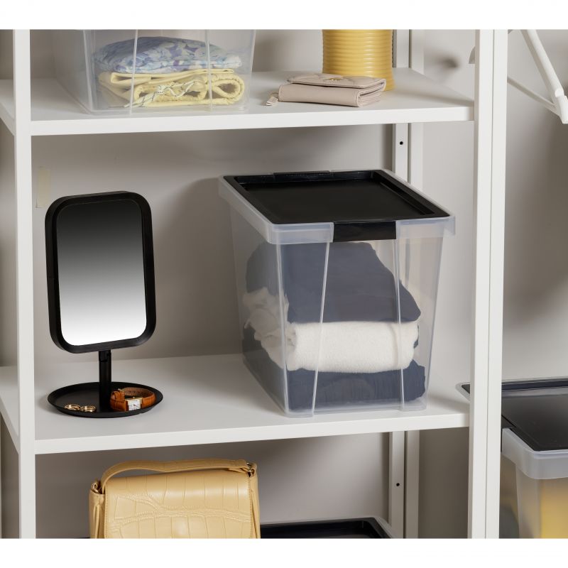 Le scatole di stoccaggio sono molto resistenti grazie alle pareti spesse e alla plastica di alta qualità. Include un coperchio con maniglie incernierate che permettono di aprirsi da un lato senza rimuoverlo completamente, e aree per etichette. Il suo design impilabile ottimizza lo spazio ed è compatibile con i vassoi organizzatori, adattandosi a diverse esigenze organizzative.