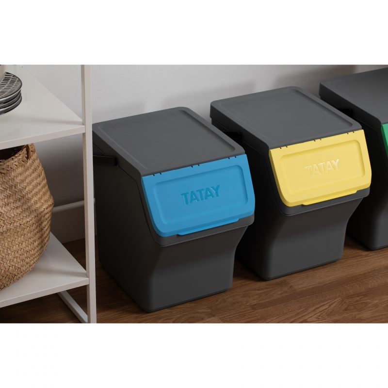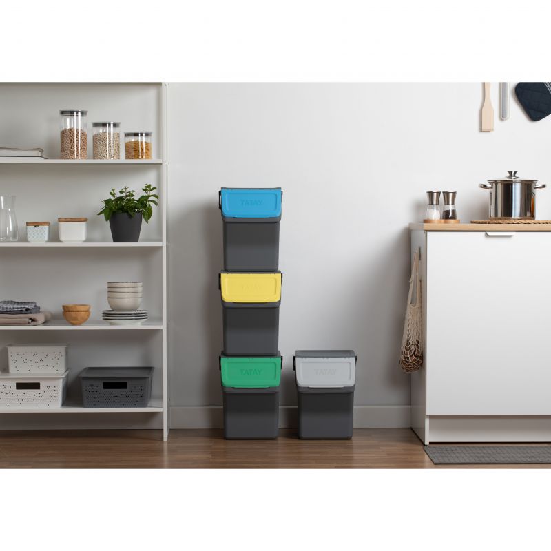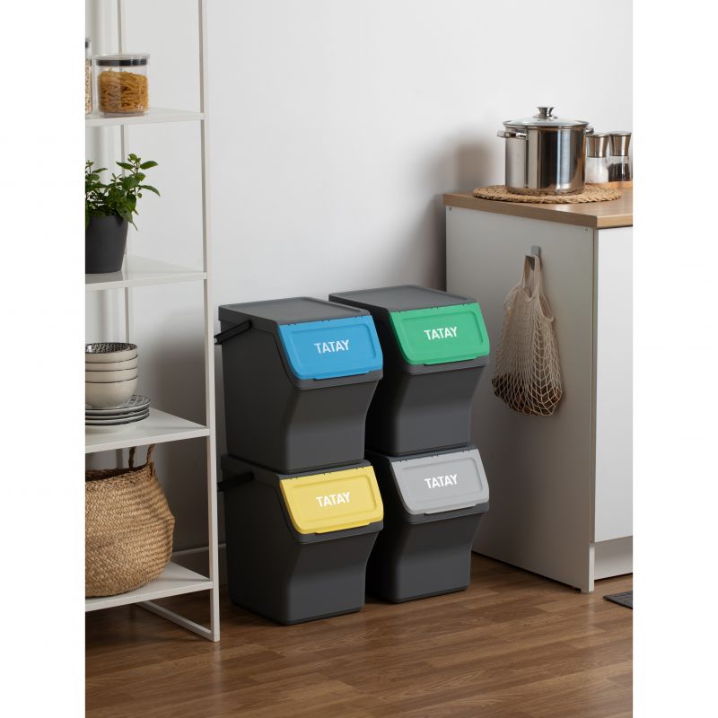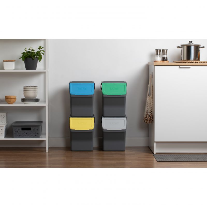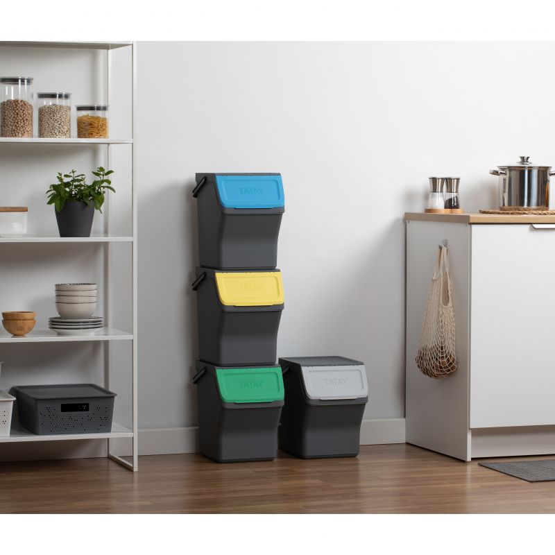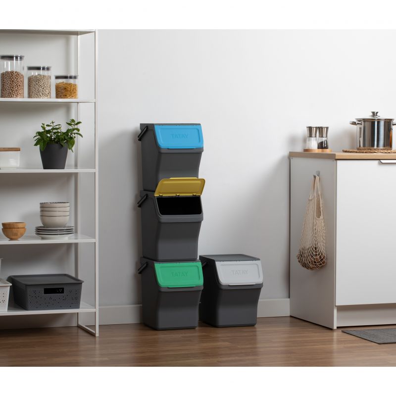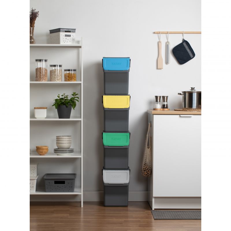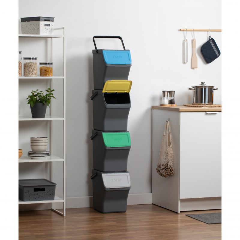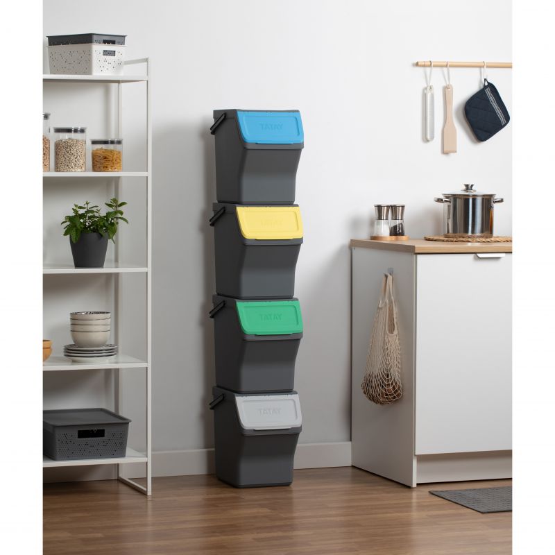 Questo set di contenitori modulari per il riciclo offre una capacità totale di 80L, distribuiti in quattro contenitori da 20L ciascuno. Realizzati in plastica riciclata di alta qualità, questi contenitori sono sicuri e resistenti. Le sue dimensioni sono 35 x 27 x 142 cm, permettendo una configurazione compatta e verticale che ottimizza lo spazio in cucina. Coperchi con apertura incernierata e apertura frontale ampia rendono facile il riciclo. Compatibile con sacchi della spazzatura da 10L e 30L.