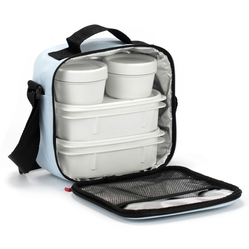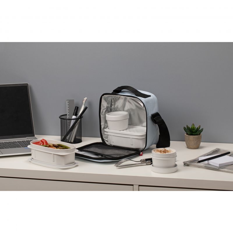 L’Urban Food Casual è una borsa termica con maniglia superiore e tracolla regolabile. Il suo corpo semirigido protegge il contenuto e l’interno isolante mantiene la temperatura. Include 2 contenitori ovali da 0,5 L e 2 contenitori rotondi da 0,2 L, ermetico, adatti al microonde fino a 100 °C e resistenti al freddo fino a -40 °C.