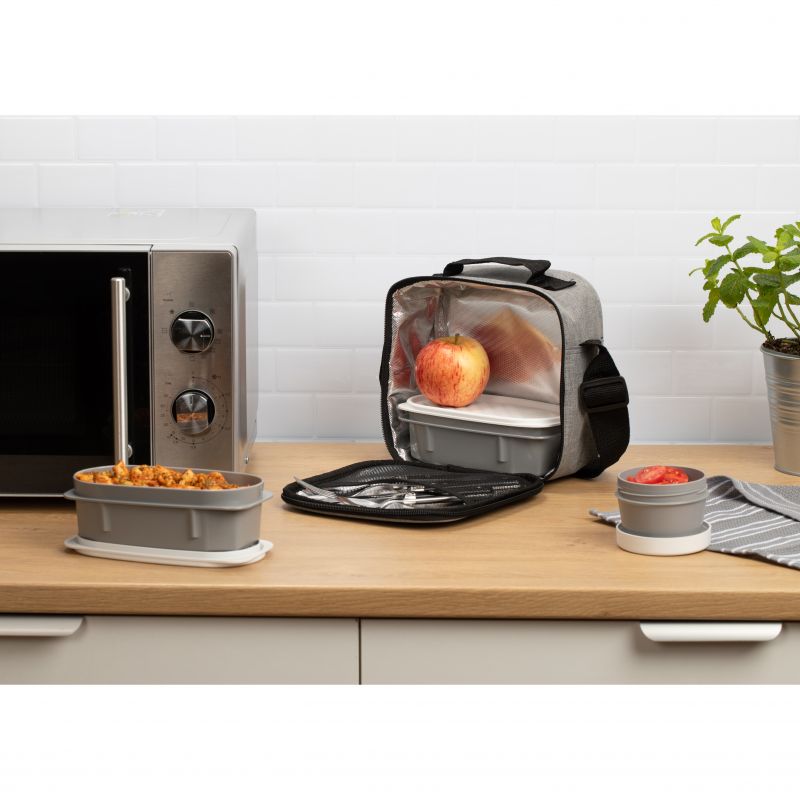 L’Urban Food Casual è una borsa termica per alimenti con manico superiore e tracolla estensibile. Il materiale tessile semirigido protegge il contenuto da possibili urti mentre all’interno ha un isolante che garantisce una migliore conservazione degli alimenti. Include 2 contenitori ovali da 0,5 L e 2 contenitori rotondi in plastica da 0,2 L. Questi contenitori per alimenti sono completamente ermetici e adatti al microonde fino a 100º. In frigorifero possono durare fino al -40%.