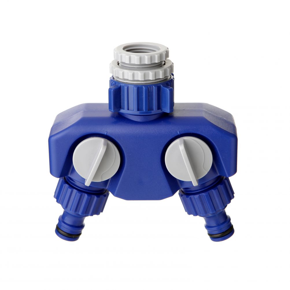 Il distributore a tubo bidirezionale con connettore universale e adattatore per connessioni da 1/2", 3/4", 1", ha un regolatore che permette di regolare il flusso d’acqua e protegge dalla luce solare. È realizzato in plastica di alta qualità, che garantisce funzionalità e durabilità in varie condizioni ambientali.