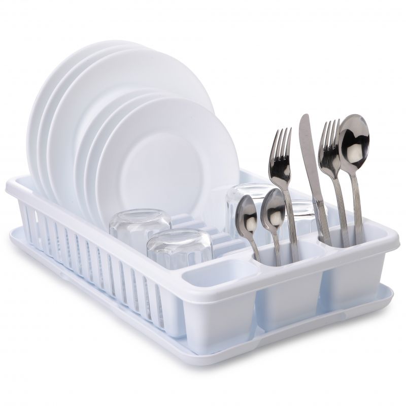 El escurridor de platos con bandeja permite almacenar el agua sobrante. Cuenta con tres huecos para cubiertos, un espacio para utensilios y dispone de 12 separadores para platos. Hecho de plástico de gran calidad, incluye ventilación inferior para escurrir el agua, dejando la vajilla seca.