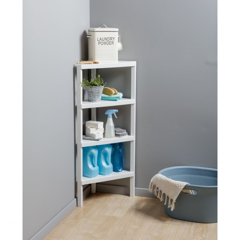 La estantería rinconera de la línea Lombok con efecto acabado madera está fabricada en plástico de alta calidad, soportando hasta 10 kg por balda. Este estante es de muy fácil montaje y no requiere herramientas ni experiencia. El mueble incluye topes antideslizantes en las patas y también anclajes para fijación en la pared. La estantería está diseñada para adaptarse a cualquier espacio y estilo de decoración.