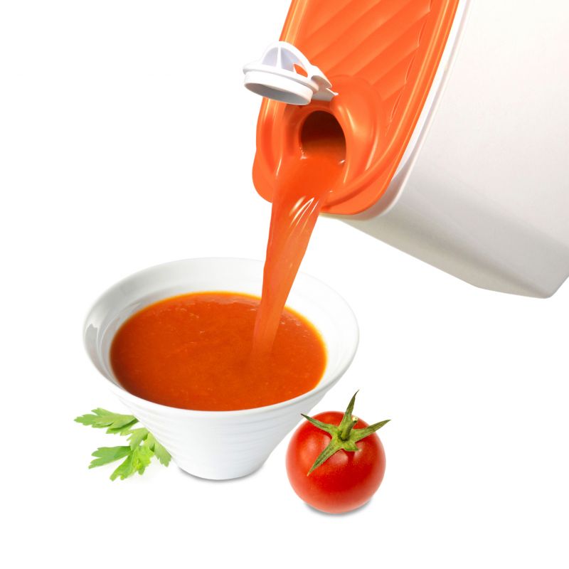 El porta gazpachos y de alimentos con sistema Fresh, que garantiza una conservación óptima de líquidos en frío para los amantes de los gazpachos, es ideal para el transporte de líquidos y alimentos como el salmorejo, con vertedor en la tapa para servir de forma limpia y elegante.