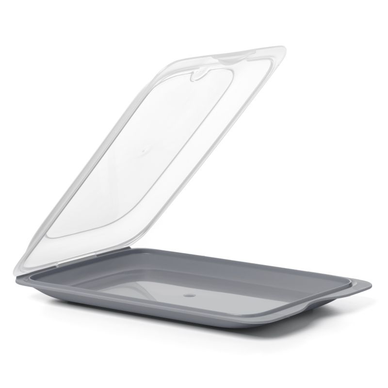 The sausage and food holder with Fresh system guarantees optimal cold storage, keeping sausages and other foods fresher for longer. Its design is perfect for storage and transportation, offering a practical and safe solution. Thanks to its stackable structure, it takes up minimal space in the refrigerator or pantry, allowing for efficient organization. Includes a removable lid, ideal for serving the tray directly on the table. It is versatile and resistant, suitable for dishwashers, refrigerators, freezers and microwaves, withstanding temperatures from -40°C to 100°C without losing its properties.