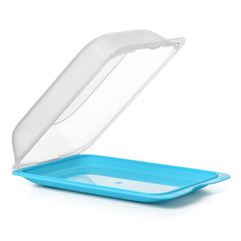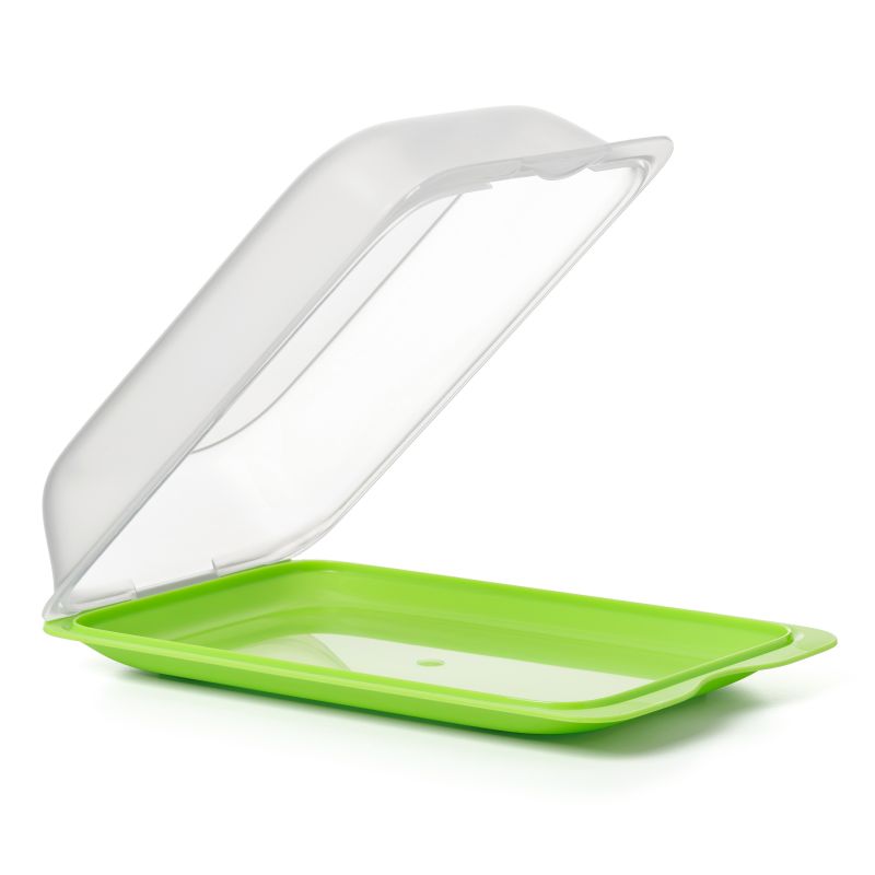 The sausage and food holder with Fresh system, now in Maxi format, guarantees optimal cold storage, keeping sausages and other foods fresh for longer. Designed for sausage lovers who need more space, it offers a practical and safe solution for storage and transport. Thanks to its stackable structure, it takes up minimal space in the refrigerator or pantry, allowing for efficient organization. Includes a removable lid, ideal for serving the tray directly on the table. It is versatile and resistant, suitable for dishwashers, refrigerators, freezers and microwaves, withstanding temperatures from -40°C to 100°C without losing its properties.