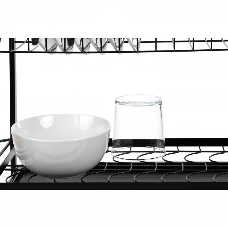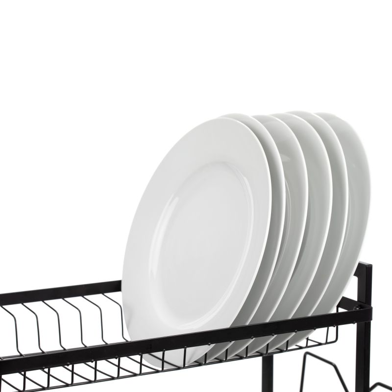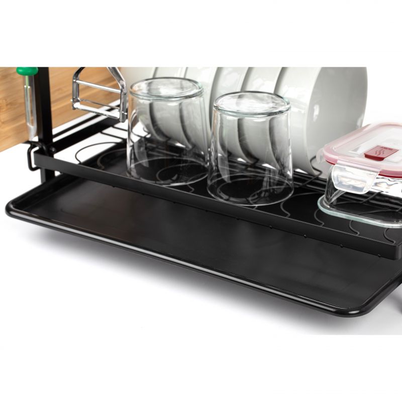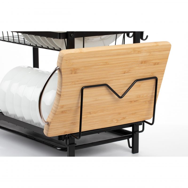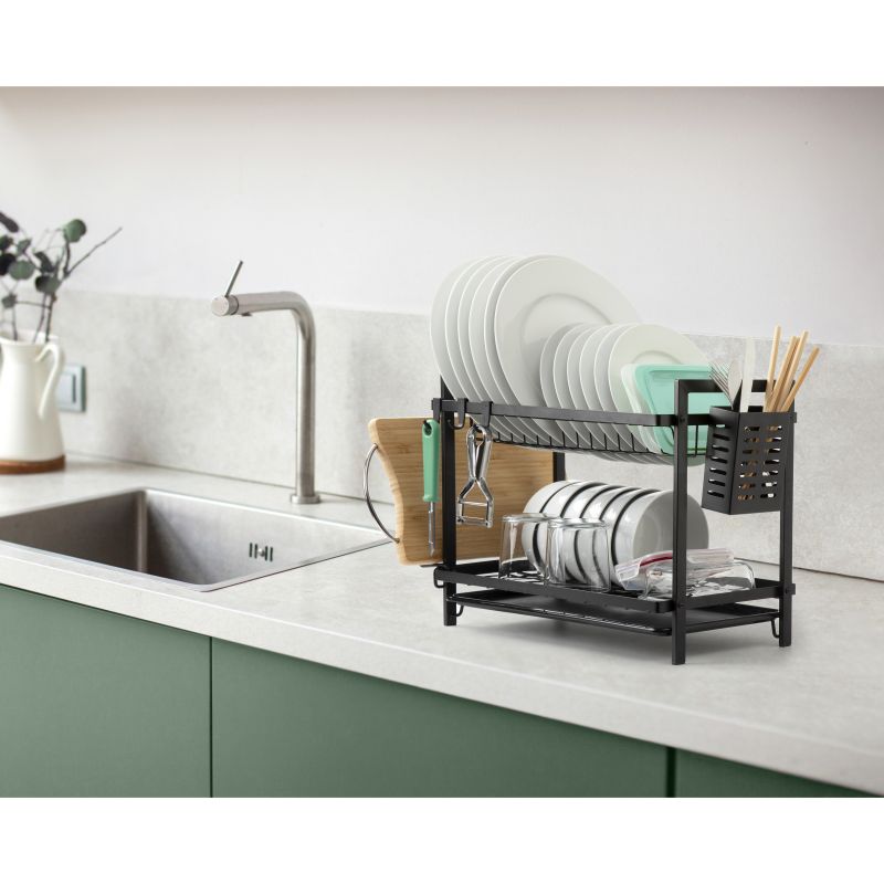 Organize your kitchen with TATAY’s high-quality metal dish drainer. This practical dish drainer is made of durable metal and features an anti-rust coating that ensures long-lasting durability and protection against corrosion. Its versatile design includes a double shelf that makes the most of space, providing an ideal solution for placing plates, glasses, cups and pans in an orderly manner. Thanks to its removable drip tray, the dish drainer allows you to easily collect and remove excess water, making cleaning easier. It also includes a removable cutlery basket, a cutting board holder, and three utensil hooks, making it a complete and functional kitchen organizer. With a capacity to support up to 30 kg and easy assembly thanks to the included tools and instructions, this dish drainer is the perfect choice to keep your countertop clear and organized.