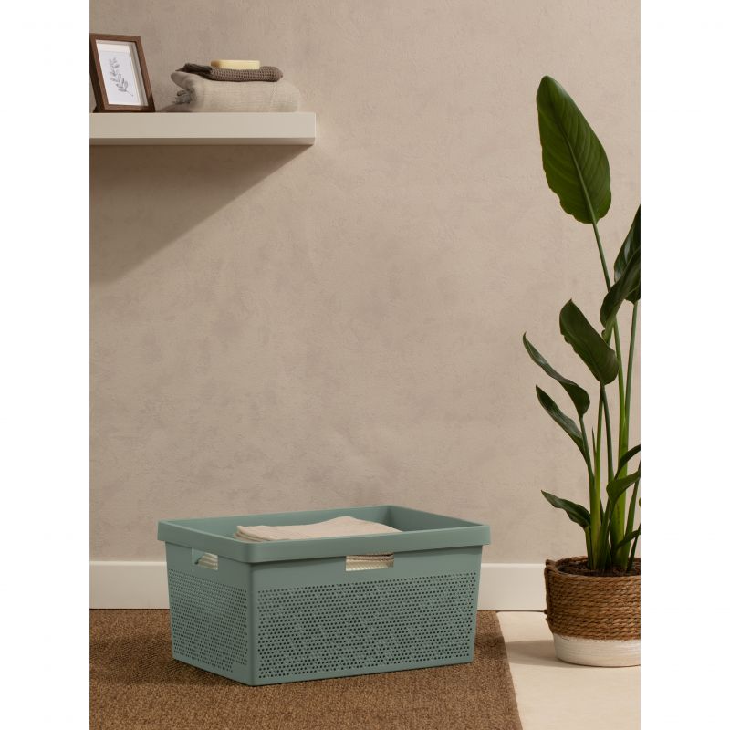The TATAY Bohol laundry basket, with a capacity of 40 liters, is made of high-quality and 100% recycled plastic, in a sophisticated sage green color. Its dimensions of 36 x 52.5 x 26 cm make it perfect for smaller spaces, offering a compact and efficient solution for storing dirty clothes. This basket combines functionality and aesthetics, being resistant and easy to clean, ideal for maintaining organization in any home. In addition, its manufacture with recycled materials makes it an ecological and sustainable option.