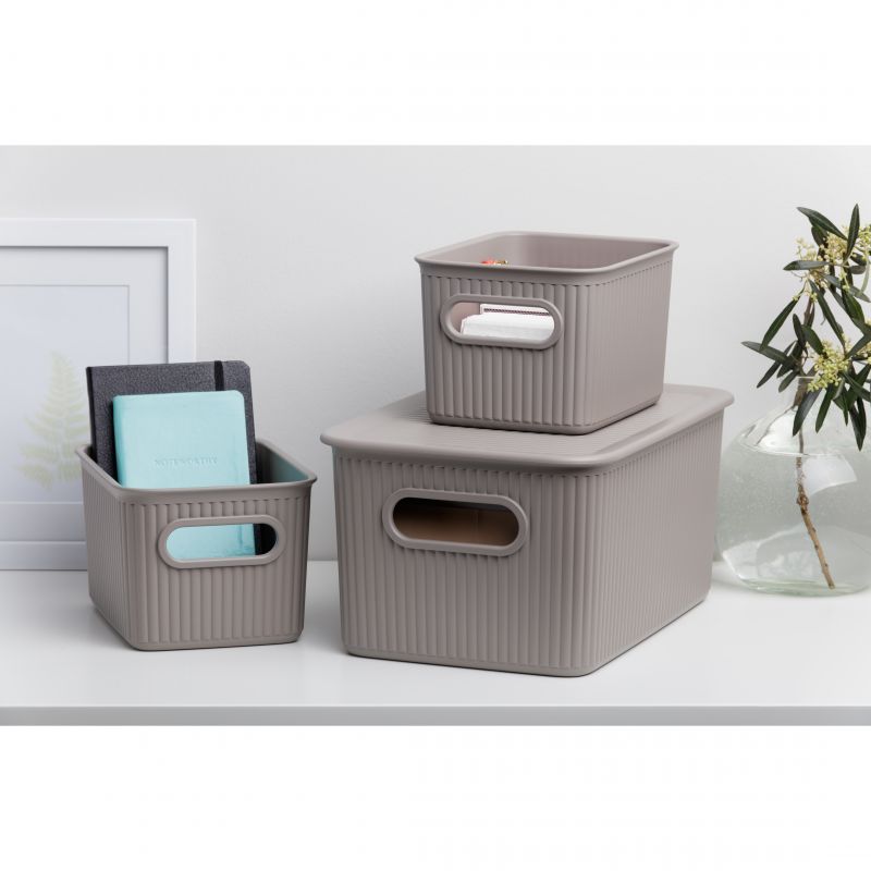The Baobab series organizing basket, ideal for organizing and storing objects. This storage box has a design with vertical waves, discreet and elegant, it is very combinable with all types of rooms. It is possible to stack them with the lid and it is made of a highly resistant and flexible material. They contain side handles that facilitate handling and the sizes are suitable for drawers.