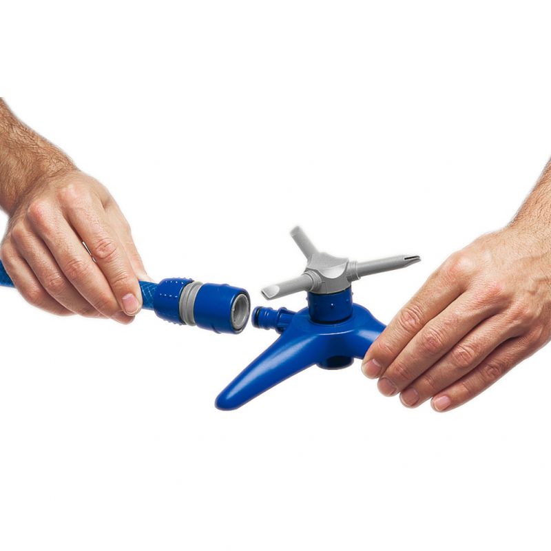 Le sprinkler à dispersion sectorielle avec des couvertures de base jusquà 80 m² et une vitesse dirrigation de 15 litres par minute. Il fonctionne à 3 bars de pression et possède un connecteur universel. Son revêtement le protège des rayons du soleil.