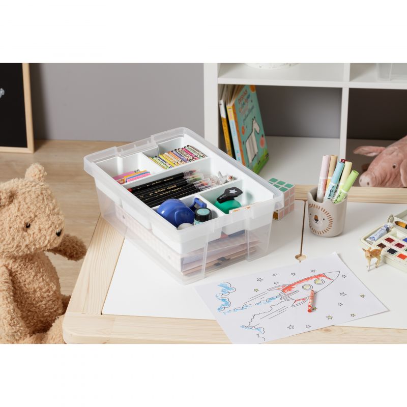 Cette boîte de rangement est très résistante grâce à l’épaisseur de ses parois et au plastique de haute qualité. Notre boîte polyvalente est dotée d’un couvercle et de poignées avec fonction charnière, avec une ouverture approximative de 100º, vous permettant de voir l’intérieur sans avoir à retirer tout le couvercle, car il peut être ouvert d’un côté tandis que l’autre poignée reste attachée au corps. De plus, sur les côtés du couvercle, il y a un espace pour mettre une étiquette afin que vous puissiez identifier rapidement ce qui est stocké dans la boîte. Il est parfait pour obtenir le meilleur rangement possible, grâce au design de son couvercle, il peut être empilé pour prendre moins de place. Vous pouvez obtenir une meilleure organisation grâce aux plateaux de rangement idéaux pour notre boîte polyvalente (vendue séparément). Le large assortiment répond aux différents besoins d’organisation, des petits objets aux grands volumes.