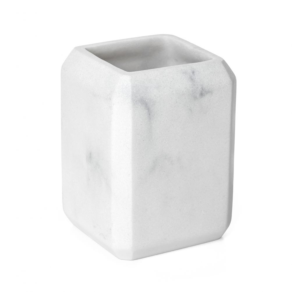Die Marble-Kollektion bietet dank ihres Marmoreffekt-Finishes, inspiriert von natürlichen Materialien, eine anspruchsvolle und helle Ästhetik. Seine geometrischen Formen und ausgewogenen Proportionen schaffen eine saubere und elegante Kulisse auf der Arbeitsplatte, die die Wahrnehmung des Badezimmers hebt, ohne den Raum zu überladen. Ein Vorschlag für alle, die Ordnung, Stil und eine unverwechselbare Note in alltäglichen Details suchen.