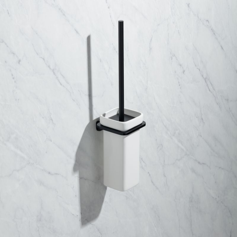 Die Wandbürste der ONYX Collection verfügt über Halterungen, Abdeckung und Griff aus mattschwarz eloxiertem Aluminium, 100 % rostfrei, mit einem weißen Keramikbehälter. Dieses minimalistische Design zeichnet sich durch quadratische, reine und klare Linien aus. Die Bürste verfügt über ein doppeltes Befestigungssystem: mit im Lieferumfang enthaltenen Schrauben und dem separat erhältlichen Glue & Fix-System ohne Bohren.