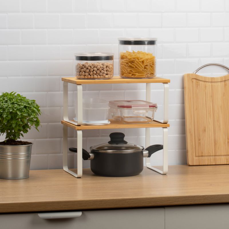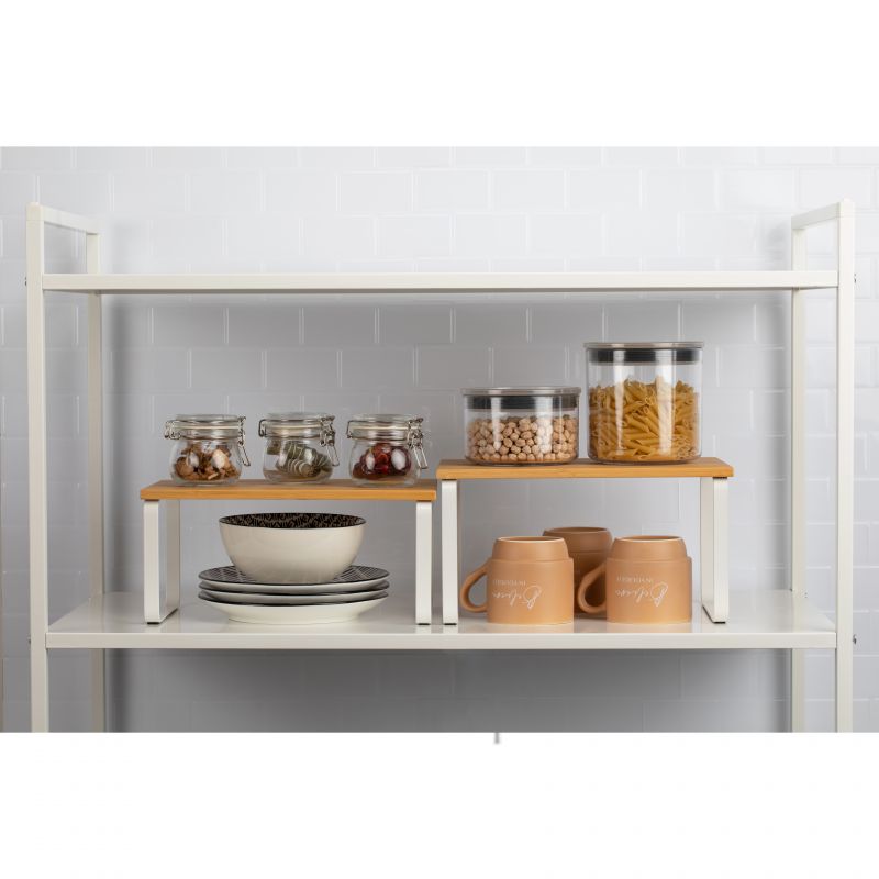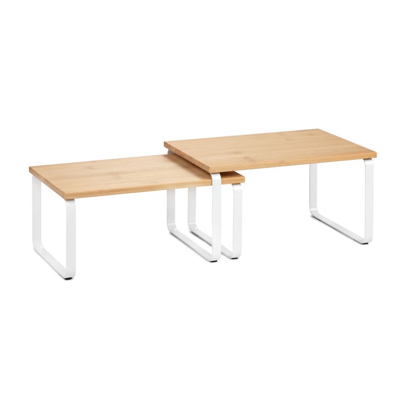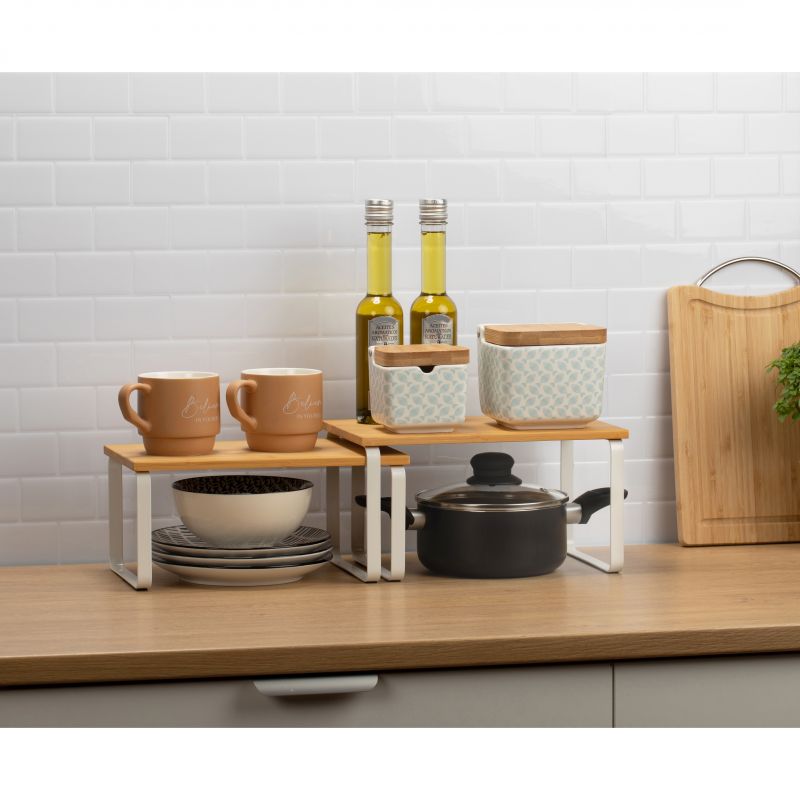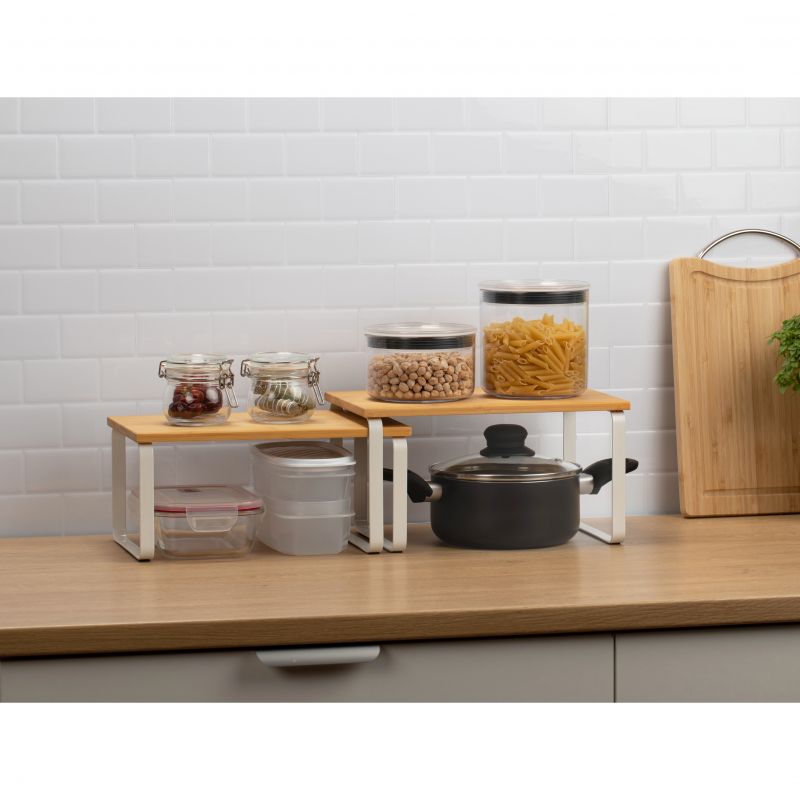 Das TATAY-Set aus 2 modularen Regalen ist die perfekte Lösung, um den Platz in der Küche und in jeder Ecke des Hauses zu optimieren. Sein modernes und vielseitiges Design ermöglicht dank seines verschiebbaren und stapelbaren Systems mehrere Konfigurationen und passt sich so allen Ihren Bedürfnissen an. Diese Regale bestehen aus stabilen Metallbeinen und einer Oberfläche aus Kunstholz und bieten eine solide und langlebige Struktur. Darüber hinaus verfügen sie über rutschfeste Polster, die jederzeit für Stabilität sorgen. Durch die schnelle und unkomplizierte Montage ist dieses Set ideal für die Organisation von Geschirr, Küchenutensilien, Speisekammern und anderen Räumen, in denen Sie Ordnung aufrechterhalten möchten, ohne auf Stil zu verzichten. Es ist leicht zu reinigen und somit eine praktische und funktionale Option für den täglichen Gebrauch.