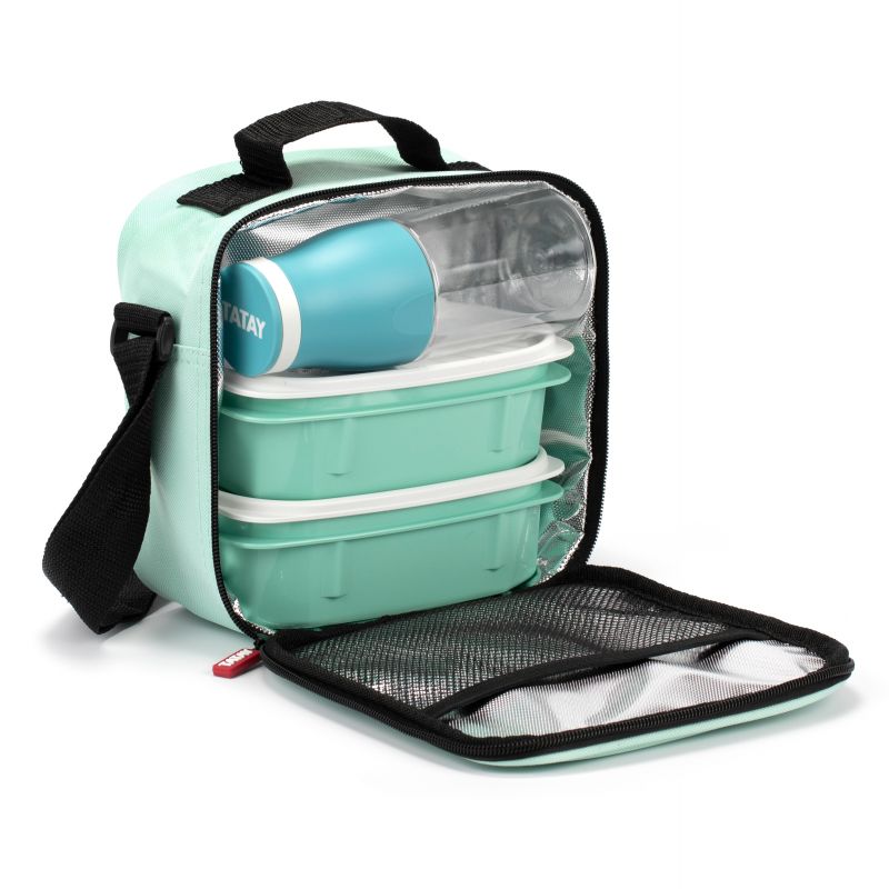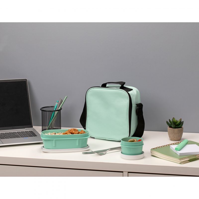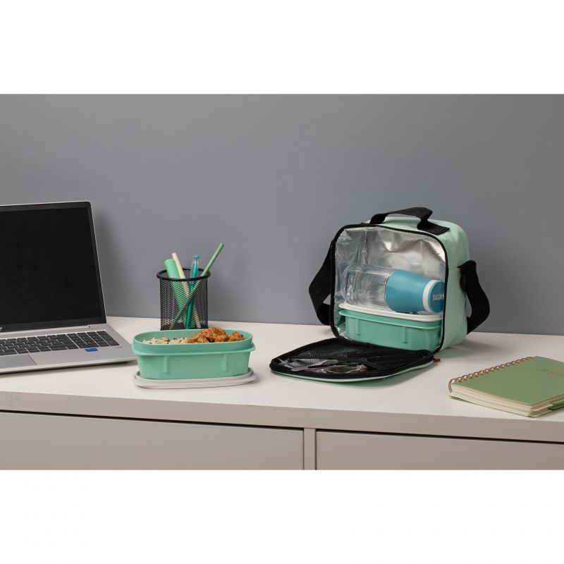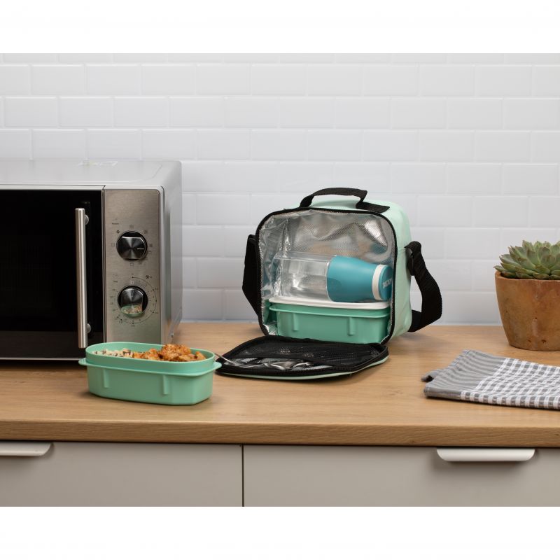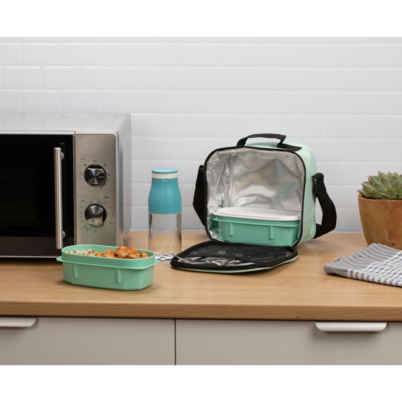 Der Urban Food & Drink Casual ist eine Thermo-Lebensmitteltasche mit Tragegriff oben und ausziehbarem Schultergurt. Das halbstarre Textilmaterial schützt den Inhalt vor möglichen Stößen und verfügt im Inneren über eine Isolierung, die für eine bessere Lebensmittelkonservierung sorgt. Enthält 2 ovale Behälter mit 0,5 l und 1 Plastikflasche mit 0,4 l. Diese Lebensmittelbehälter sind absolut luftdicht und mikrowellengeeignet bis 100 °C. Im Kühlschrank sind sie bis zu -40 % haltbar.