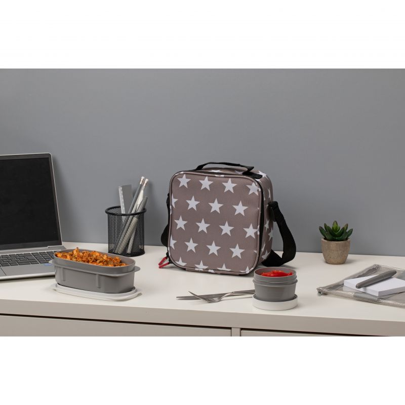 Der Urban Food Casual ist eine Thermo-Lebensmitteltasche mit Tragegriff oben und ausziehbarem Schultergurt. Das halbstarre Textilmaterial schützt den Inhalt vor möglichen Stößen und verfügt im Inneren über eine Isolierung, die für eine bessere Lebensmittelkonservierung sorgt. Enthält 2 ovale 0,5-l-Behälter und 2 runde 0,2-l-Behälter aus BPA-freiem Kunststoff. Diese Lebensmittelbehälter sind absolut luftdicht und mikrowellengeeignet bis 100 °C. Im Kühlschrank sind sie bis zu -40 % haltbar.