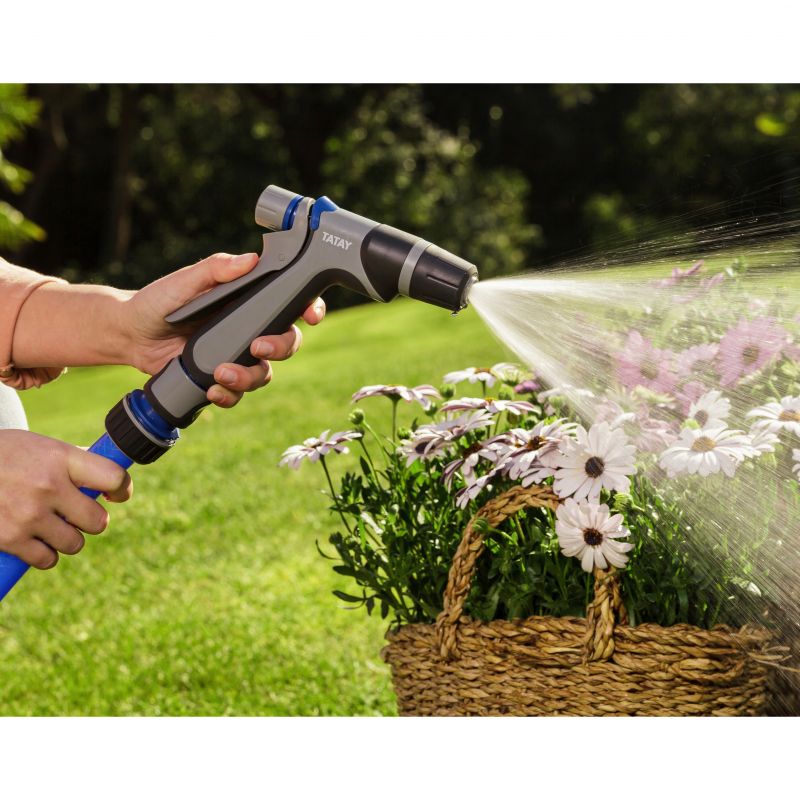 A pistola de mangueira de gama premium possui um conector universal para todos os tipos de conectores rápidos e oferece 2 posições de jato de água. Fabricado em plástico de alta qualidade, é resistente aos raios solares.